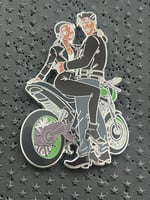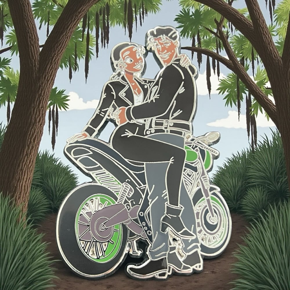 The eighth design in the Biker series features Tiana and Naveen from The Princess and the Frog. Tiana is wearing a black leather jacket with black leather pants with her legs wrapped around Naveen. Naveen is also wearing a black leather jacket with jeans and biker boots. The motorcycle is a "sporty" Kawasaki style motorcycle with a a color scheme related to The Princess and the Frog.