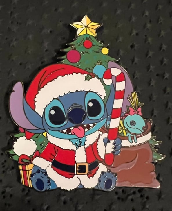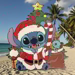 The eigth design in the Christmas series features 'Santa' Stitch holding a giant candycane with his tongue sticking out in front of a Christmas tree. A sack of toys with Scrump hanging out of the top can be seen beside Stitch.