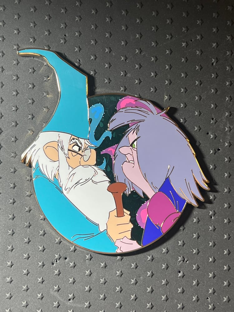 The eight design in the Dueling Duos series features Merlin & Madam Mim face to face as she challenges Merlin to a wizards duel. Madam Mim has a sinister look on her face with a pinkish purple smoke behind her. Merlin is seen with a stern look on his face holding his staff with light blue smoke behind him. The background has blue recessed metal effect (similar to that on profile-style pins).