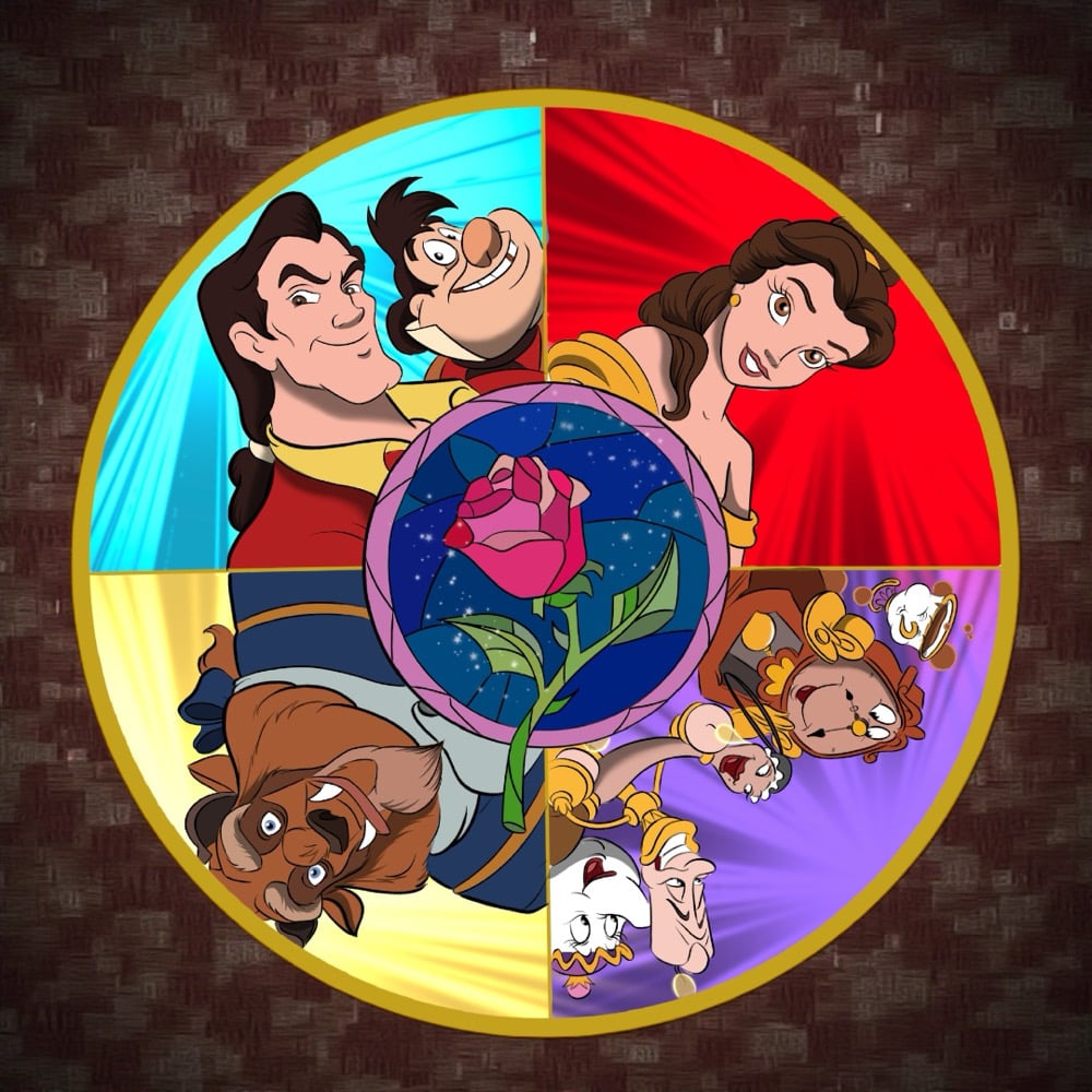 The second design in the Iconic series features characters from Beauty and the Beast. The pin is divided into four quadrants featuring Gaston and LeFou, Belle, Lumiere, Cogsworth, Mrs. Potts, Chip, and Beast. The background features a sandblast effect over transparent enamel. The middle rose medallion has a pin on pin element.