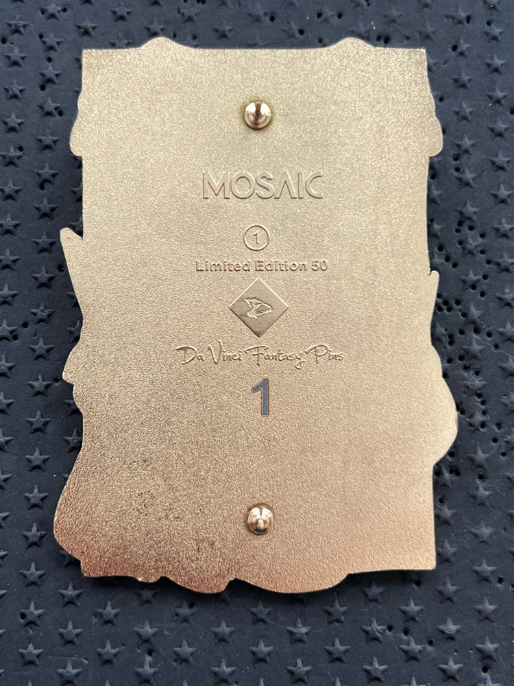 The first design in the Mosaic series features Belle from Beauty and the Beast. Belle is seen in her yellow dress holding the famous red rose from the North Tower. The background features a stained glass mosaic effect. This jumbo pin will be the perfect addition to your Belle collection.