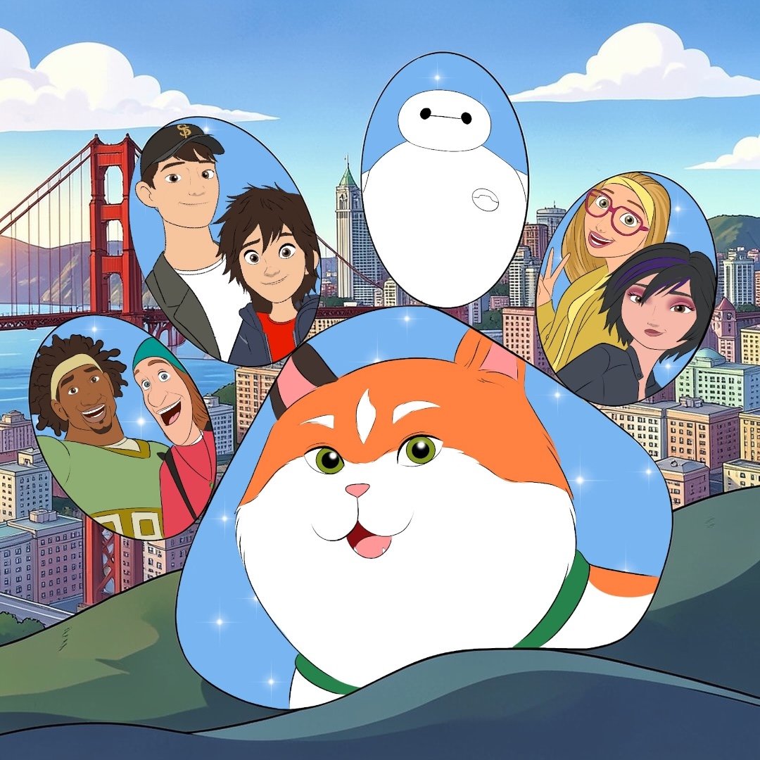 The nineteenth pin in the Paw Prints Series featuring Mochi from Big Hero 6. The toes feature supporting characters Wasabi/Fred, Tadashi/Hiro, Baymax, and Honey Lemon/Gogo. The background has a pearlescent (swirl) effect.