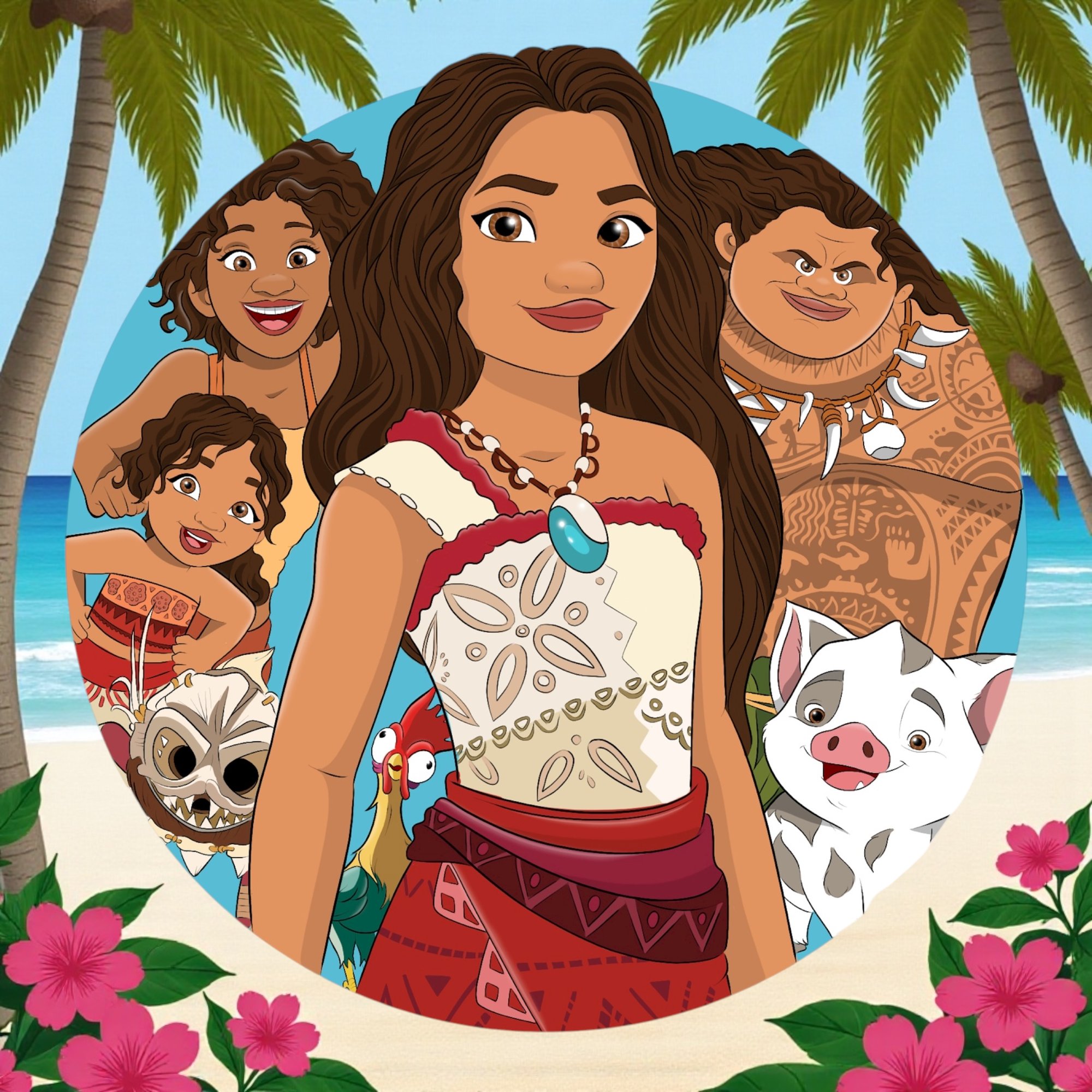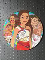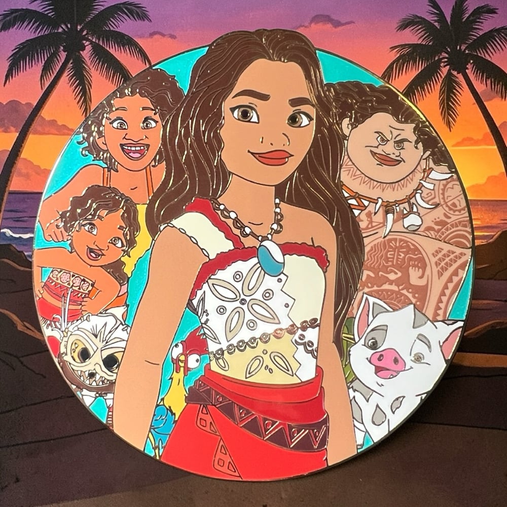 The fifth design in the Royal Centerpieces series features Moana and the supporting cast - Maui, Pua, Hei Hei, Kakamora, Simea, and Loto in a cluster portrait pose. Moana is donning her Polynesean dress while wearing her Heart of Te Fiti locket.