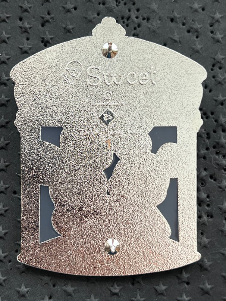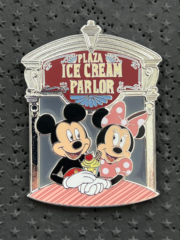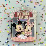 The fourth pin in the 'Sweet' series features Mickey and Minnie holding hands outside the Plaza Ice Cream Parlor indulging over a sundae. Mickey has a smile on his face while Minnie has her typical bashful, flattering smile. The Sweet series features duos in a treat setting. Pin has a raised metal Stained Glass effect on the "glass window" 3D (raised metal) characters.
