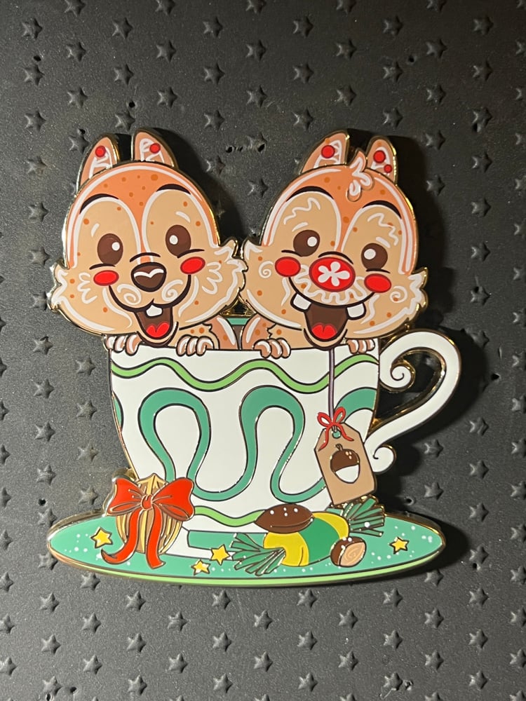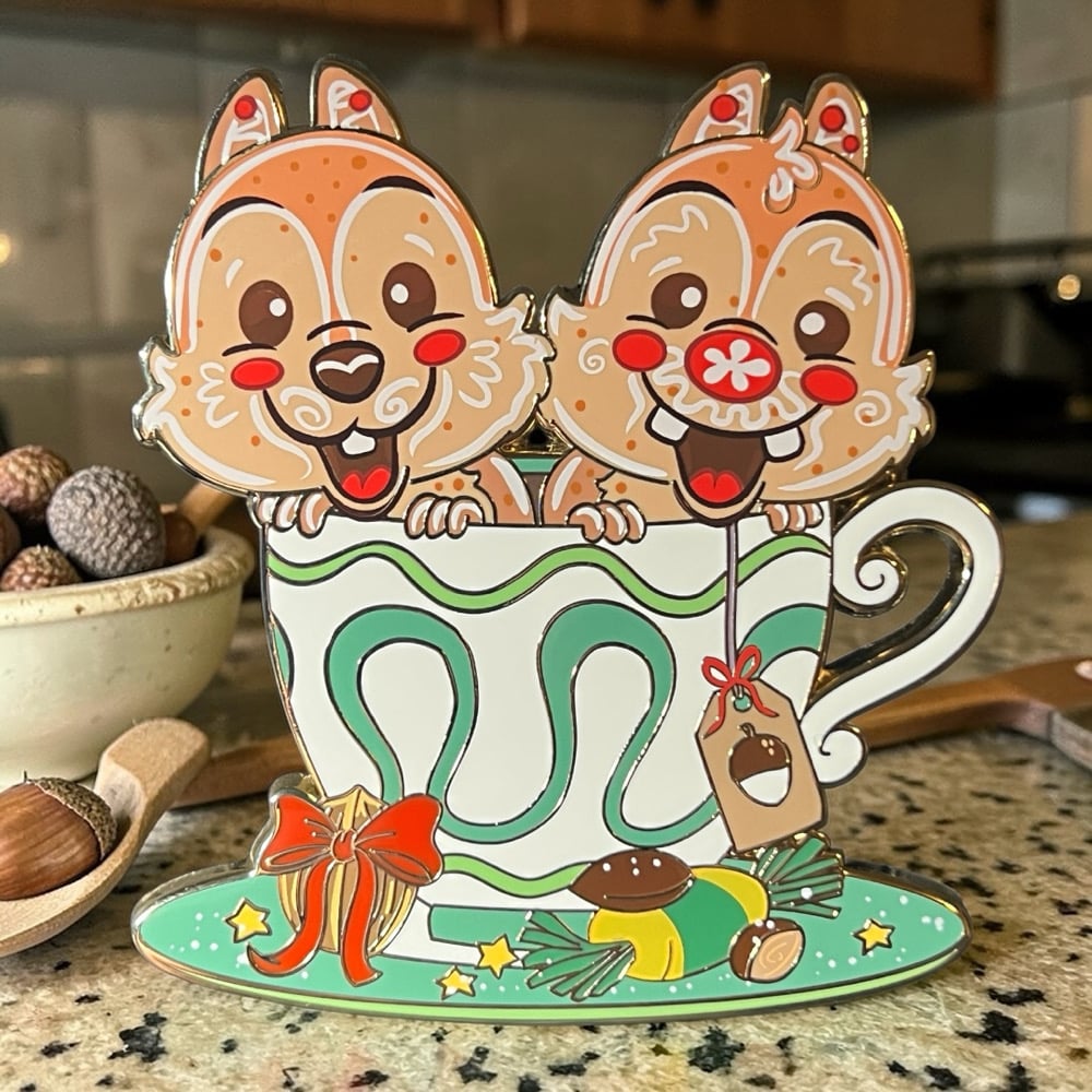 The fifth design in the Teacups series features everyone's tiny duo, Chip & Dale. Chip & Dale are in their "gingerbread-cookie" form inside the teacup. There are several tributes to Chip & Dale - an acorn on the teabag, candy in the shape of various nuts, etc.